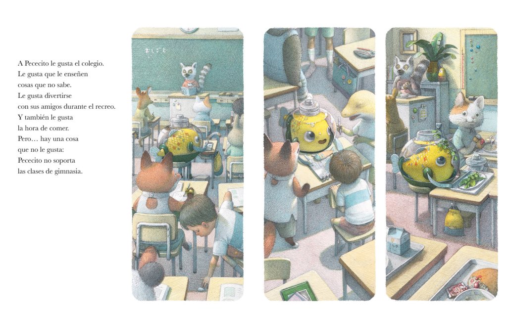 Cada matí, el Pececillo es posa els pantalons de goma, s’ajusta el casc ple d’aigua i es calça les sabatilles a les aletes… Tot i que és un peix, ha d’anar a l’escola com qualsevol nen. Li encanta aprendre, jugar i xerrar amb els amics… excepte quan toca gimnàstica. Caminar amb aletes ja és complicat, però córrer és gairebé impossible! Tot i així, Pececillo no es rendeix i s’esforça per córrer tant com els altres. Però quan un accident ho obliga a quedar-se a casa, descobrirà que no està sol.