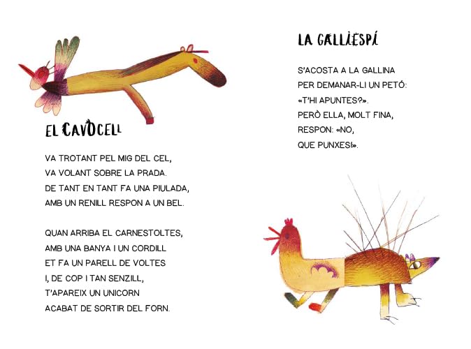 Un llibre infantil il·lustrat amb textos plens d’humor i imaginació! Aquest àlbum de poesia visual convida els infants a explorar dotze animals imaginaris com la Galliespí o el Cocopard. Un joc poètic i creatiu per estimular la fantasia, el llenguatge i la curiositat dels més petits.